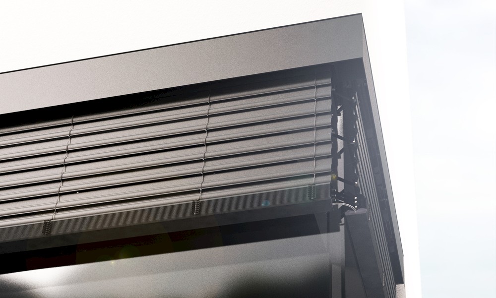 Vi presentiamo un nuovo sistema per l’oscuramento con veneziane con giunto angolare di vetro. Il sistema offre una vista panoramica indisturbata, poiché non presenta guide negli angoli.