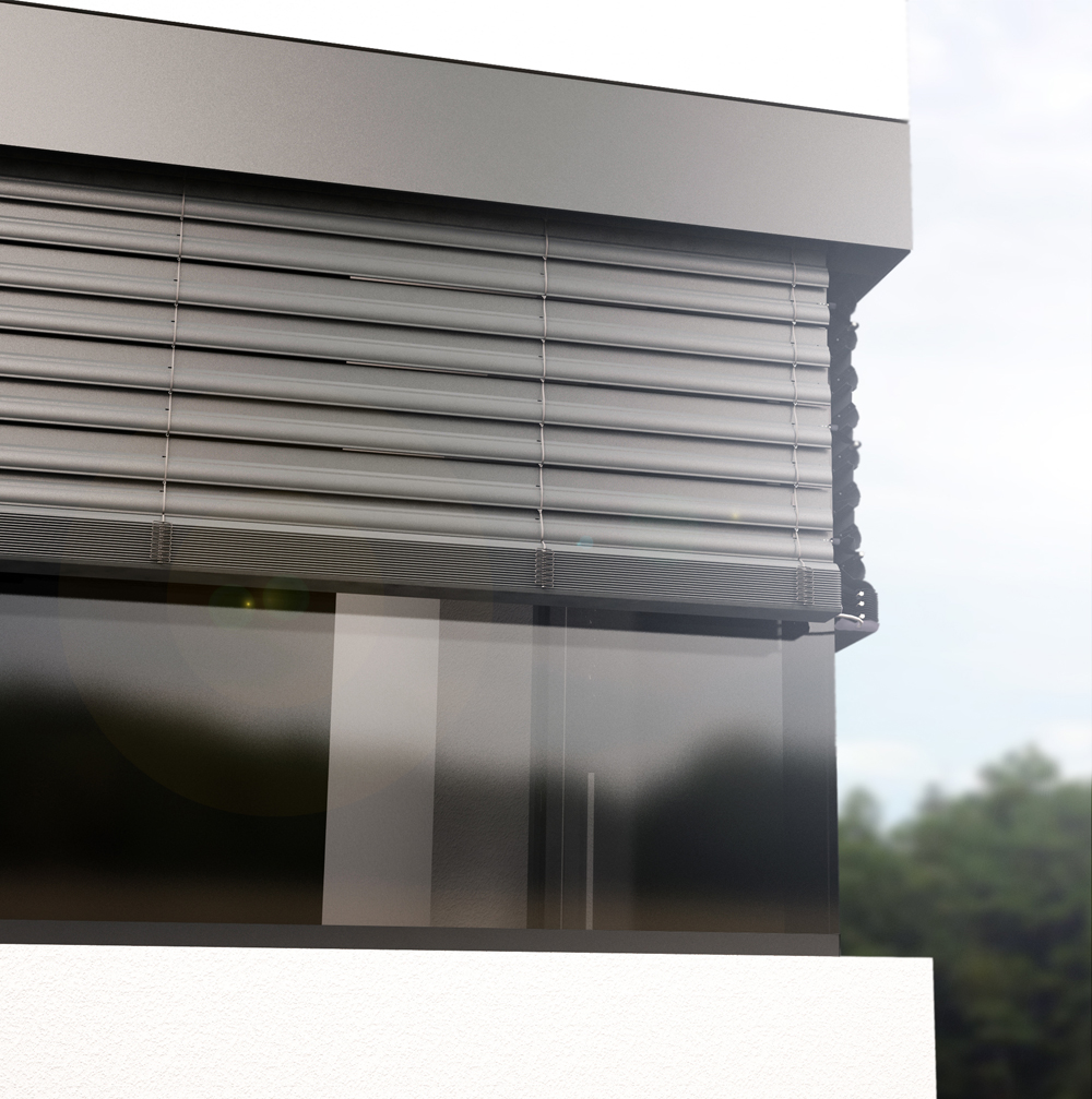 Al posto della guida nell’angolo è presente un giunto metallico su ogni quarta lamella. Quando le lamelle sono sollevate nel cassonetto, sul giunto non rimane nulla. Il comando può essere manuale o a motore con interruttore o a distanza.